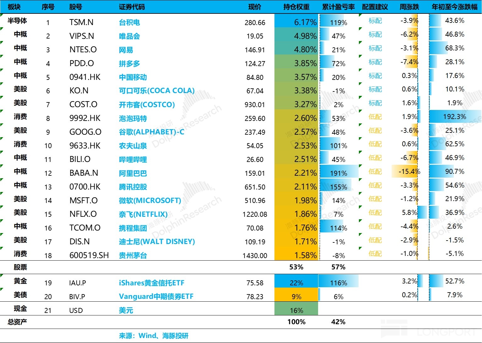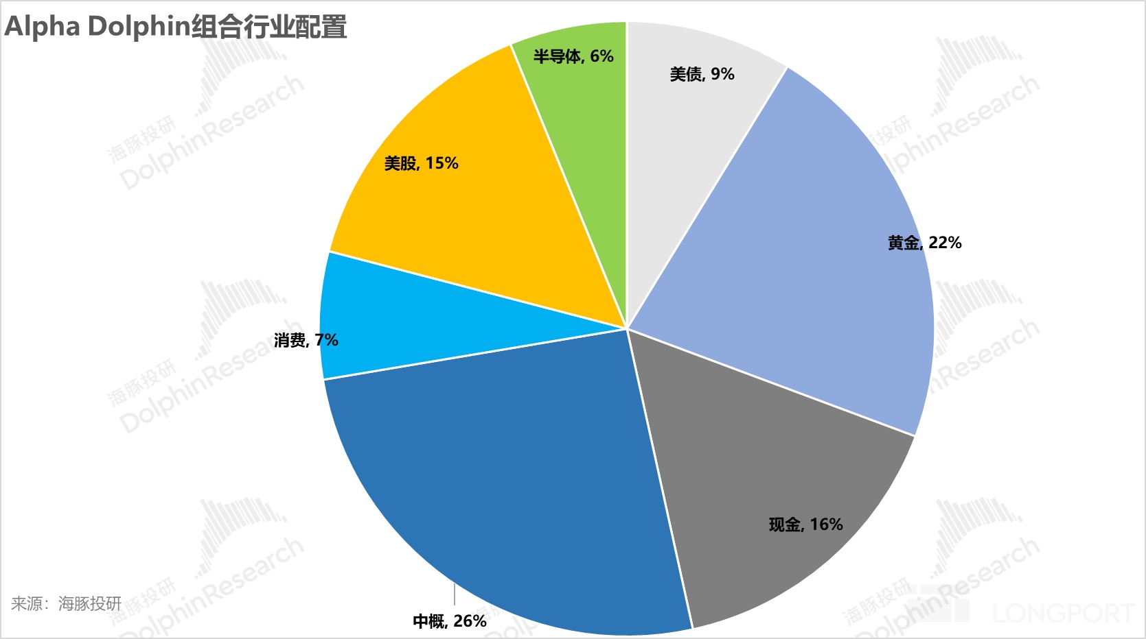 Alpha Dolphin 虚拟组合共计持仓 18 只个股与权益型 ETF,其中标配 7 只,其余低配。股权之外资产主要分布在了黄金、美债和美元现金上,目前权益资产与黄金/美债/现金等防守资产之间大约 55:45。