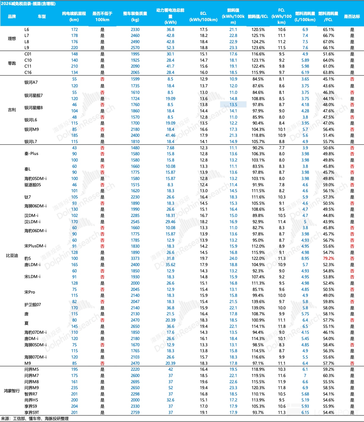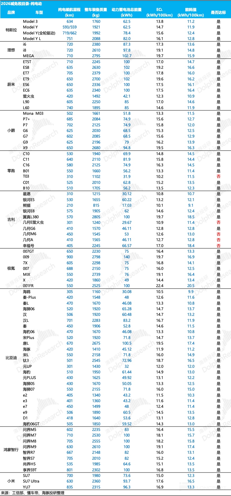 为了更直观地评估新政策的实际影响,海豚君对已覆盖的多家新能源车企在产在售的纯电车型(若存在新旧款同时销售的情况,选取新款车型)进行了逐一测算,并整理出能够进入 2026 年及以后生效的《减免税目录》的车型名单。