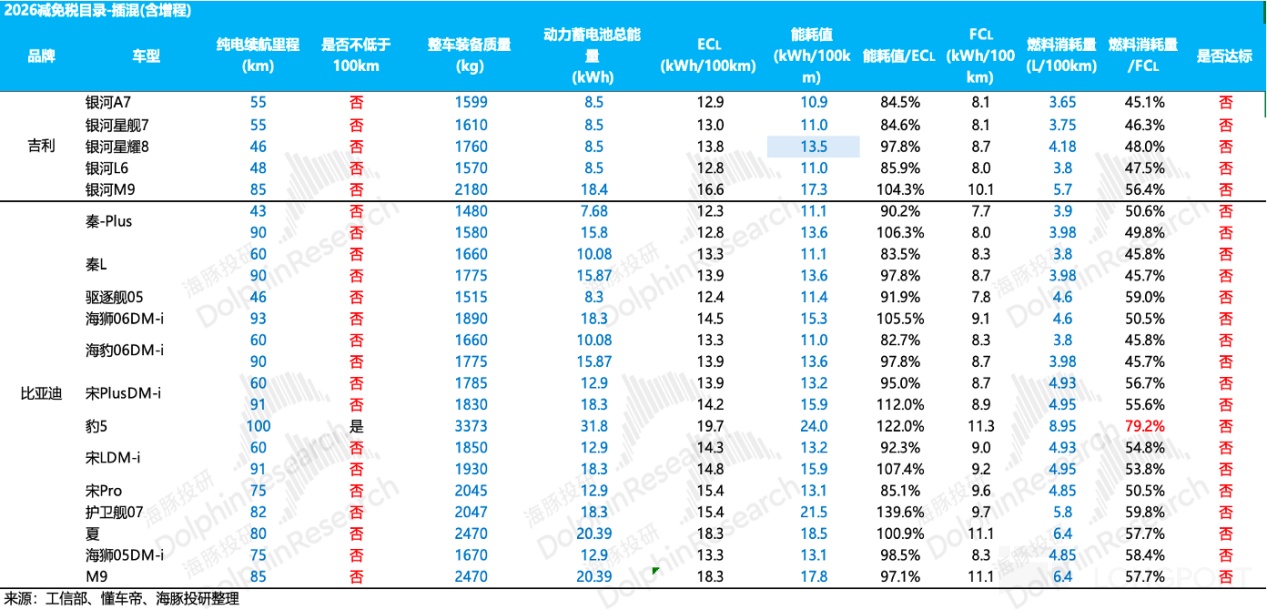 为整理出能够进入 2026 年及以后生效的《减免税目录》的车型名单。海豚君对已覆盖车企的在售 PHEV 车型(共 40 余款)进行达标测算,发现从单个车企维度的影响: