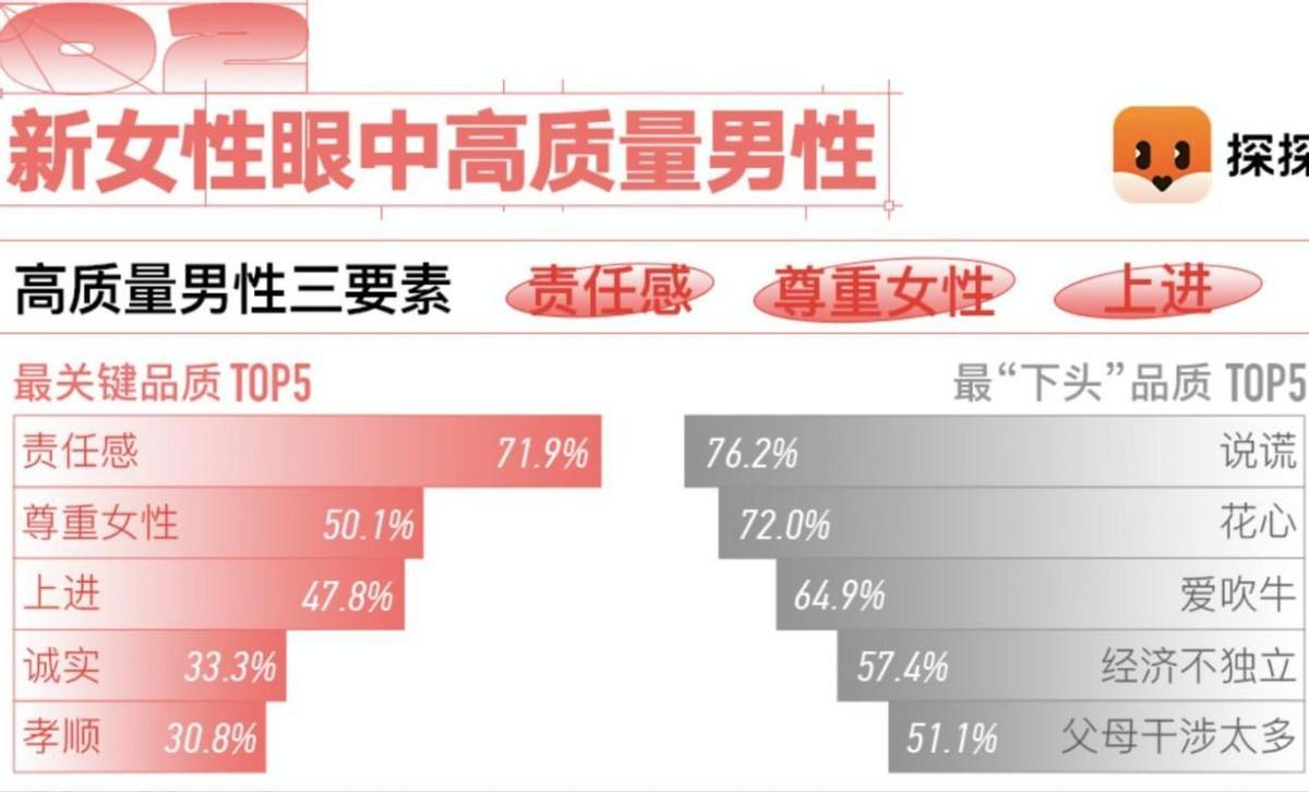 此外报告中还提到,“责任感、尊重女性、上进”,是女性最容易产生好感的男性三大品德。