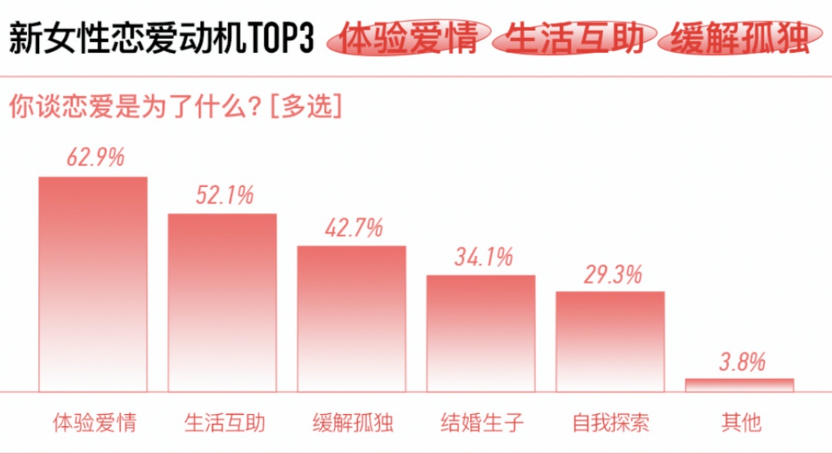 现代女性通过婚姻获取生存资源的需求已经大大降低,对爱情的需求也愈发纯粹,在对当代新女性的恋爱动机调查中,有 62.9% 的女性选择 “体验爱情”。
