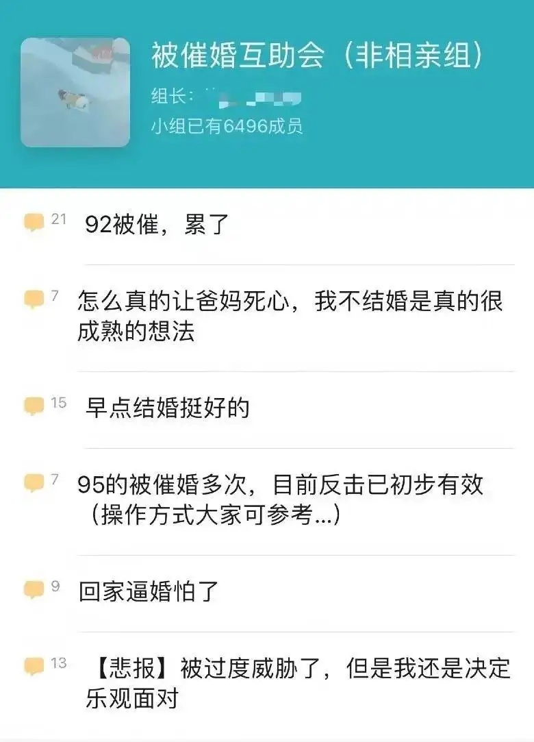 在知乎“被催婚互助会”小组中,已有近 7000 名成员,他们对催婚的探讨从 “想放弃” 到反催婚话术、操作方式,尽管不能断定他们最后的结果,但字里行间的 “不情愿” 味道十足。