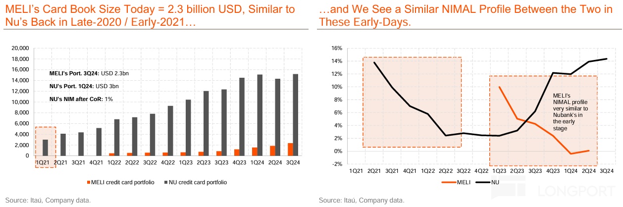 可以看到Nu Bank的NIMAL回到高点花费的时间大约是3年左右。而当前Meli的信用卡贷款余额(仅巴西市场)正巧与Nu Bank在1Q21时的规模接近。因此,Meli也很有可能复现Nu Bank的经历,在未来2~3年内随着信用卡业务的成熟,信用卡业务的NIMAL会从当前的负值逐步回升到约10%上下的常规水平。