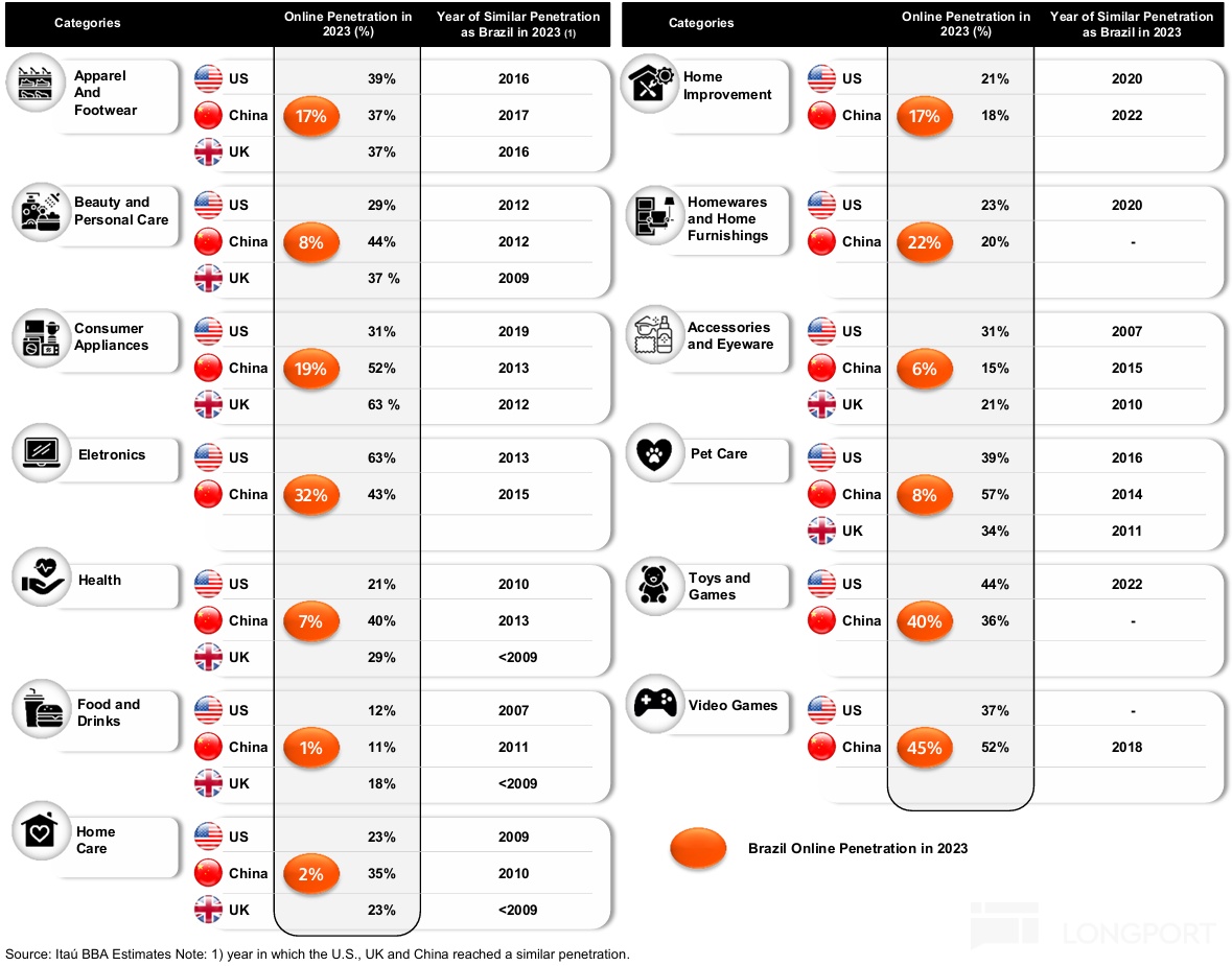 以巴西市场更详细的看,在2023年其线上渗透率较高的商品品类包括玩具、电子游戏、数码产品和家具。这四类商品属于典型的“电商优势品类”,且在巴西的渗透率相比中美等成熟市场差距不太。但在同样也属“电商优势品类”的鞋服、美护用品,以及其他传统“电商劣势品类”的食品饮料和各类日常用品上,巴西和成熟市场的渗透率差距则非常明显。