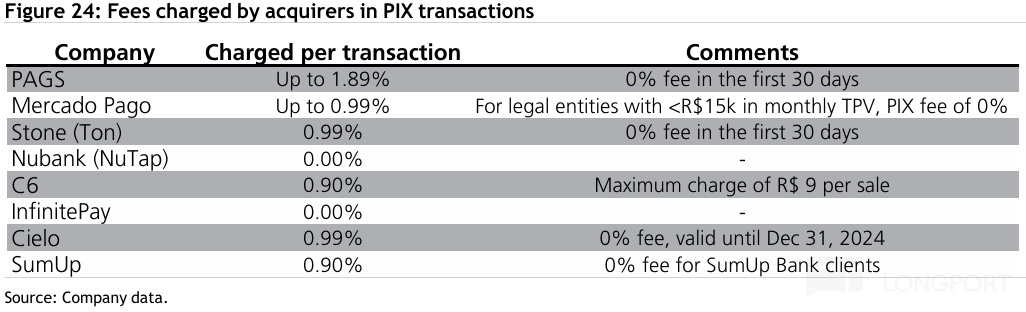 但另一方面,由于PIX低费率的特性,也会明显拖累支付公司们的平均支付手续费率。由下表可见,大多数支付收单商对PIX收取的手续费率仅0.99%,对特定用户群体或限定时间内甚至可以低至0%。相比之下,对借记卡和信用卡支付可收取的费率则达1.5%~5%左右。