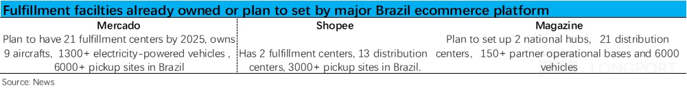 根据新闻报道,Shopee和Magazine都于2024年下半年开始了自建物流和仓储中心,提供仓配式履约。下表总结了根据媒体报道,Meli、Shopee和Magazine三个平台在2025年左右已经或计划建设的物流履约设施。可以看到,Meli目前在巴西拥有的仓配中心等设备数量相比对手仍有数倍领先,但后两者也已拥有了一定规模且成体系的配送网络。