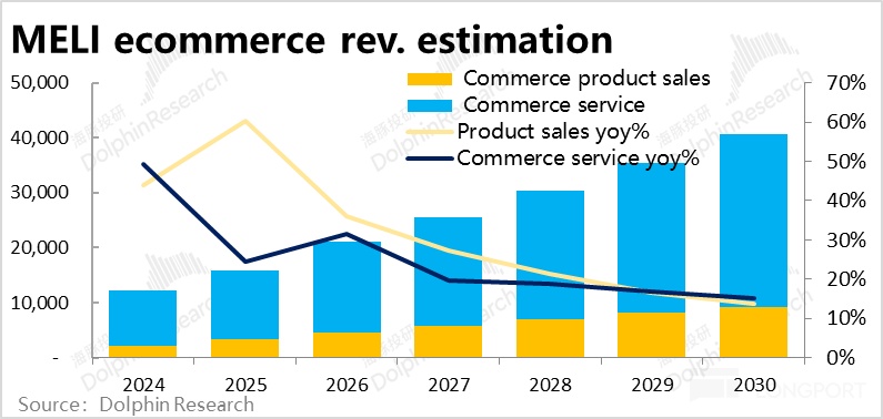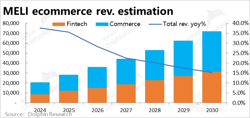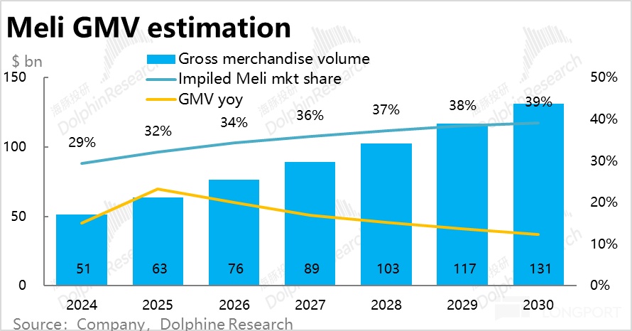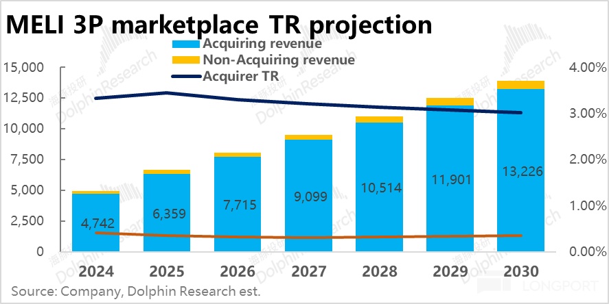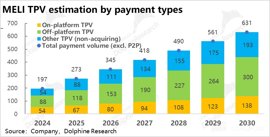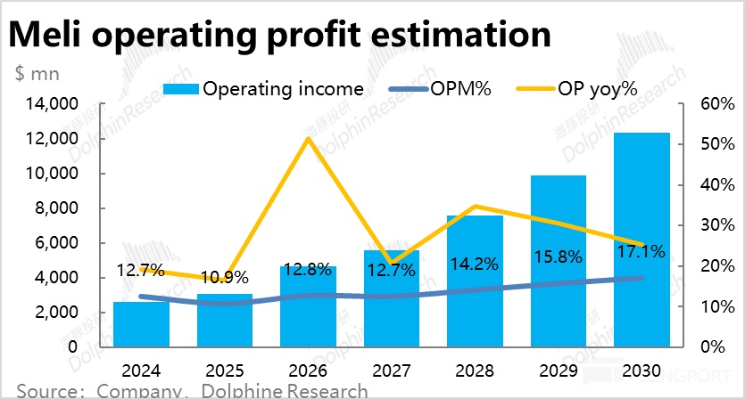 汇总体系外收单、体系内收单、及非收单性支付,海豚预计Meli总体TPV后续5年内的复合增速约为18%。即到30年比25年增长约1.3倍。