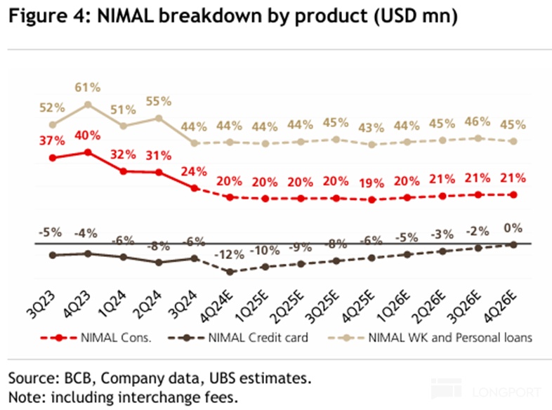 但参考某业内同行—Nu Bank的经验。可以看到,Nu Bank历史上在1Q21~2Q22期间,也出现过信用卡贷款规模快速增长时,NIMAL从14%左右快速下滑到2%左右的情况。而后续随着Nu Bank的信用卡贷款额增速的放缓(从大几十%下滑到50%以下),到4Q23,Nu Bank信用卡业务的NIMAL又快速回升到了原先14%左右的水平。