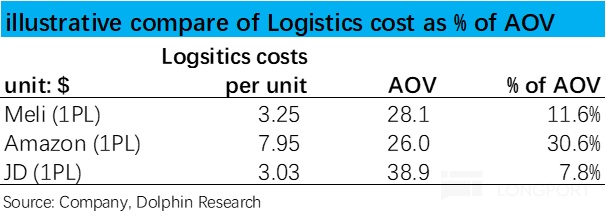 根据海豚的测算,Meli目前的单均履约成本约占客单价的11%~12%左右,相比国内京东(第一方仓储模式)的约7~8%履约费用率,仍有相当明显的效率差距。验证了对人均消费能力还弱于中国的拉美居民而言,拉美电商目前的履约成本确实是是偏高的,还有着很大的改进空间。