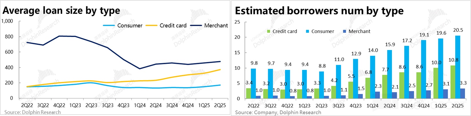 根据我们的第二篇覆盖,公司信贷业务值得注意之处是,推出最晚的信用卡贷款后发先至,截至2Q25已成为规模体量最大且增速也最高的细分板块,25年同比增速有望达100%左右,明显高出消费贷和商家贷都大约在50%上下的增速。