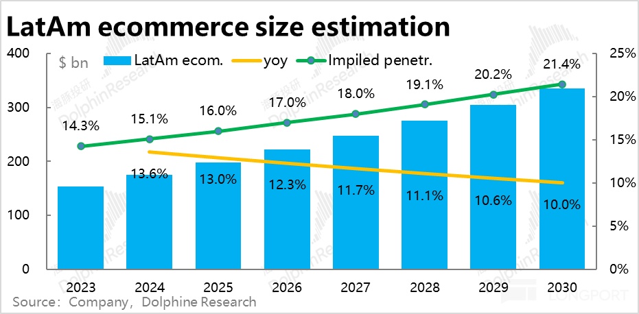 因此出于谨慎,海豚偏保守的预期2025~30年5年间拉美电商市场整体的复合增速大约在11%左右。30年较25年增长约70%,总规模达3350亿美元。但需要强调,由于没法准确预判履约效率和线上渗透率爆发性提升的节点何时会到来。实际表现向上偏离的风险大概率高于其向下偏离的风险。