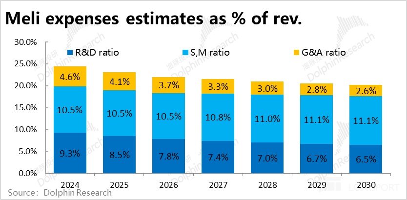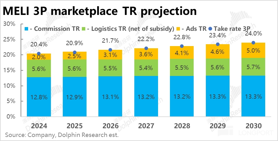 基于上述判断,对Meli平台电商业务的变现率,除了预期广告变现率能从2024年的约2%到30年大幅提升至5%(离亚马逊的7%~8%仍有距离),其他佣金和履约变现都仅预期震荡或略微走高。3P平台业务的变现率从20.4%,提升到约24%。