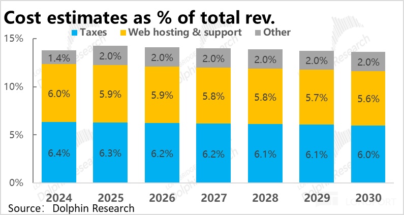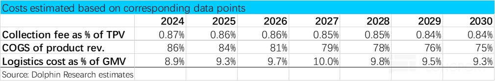 在营收之外,海豚也结合公司的披露以及外行的预测,对公司的成本进行了拆分预测。具体分为两大类:a. 直接与总营收相关的,包括销售税费,平台支持成本和其他成本;b. 另一大类成本则与匹配的业务相关直接相关,包括资金成本匹配信贷业务,履约成本匹配电商物流,支付成本匹配支付业务,以及商品销售成本匹配自营电商和POS销售收入。