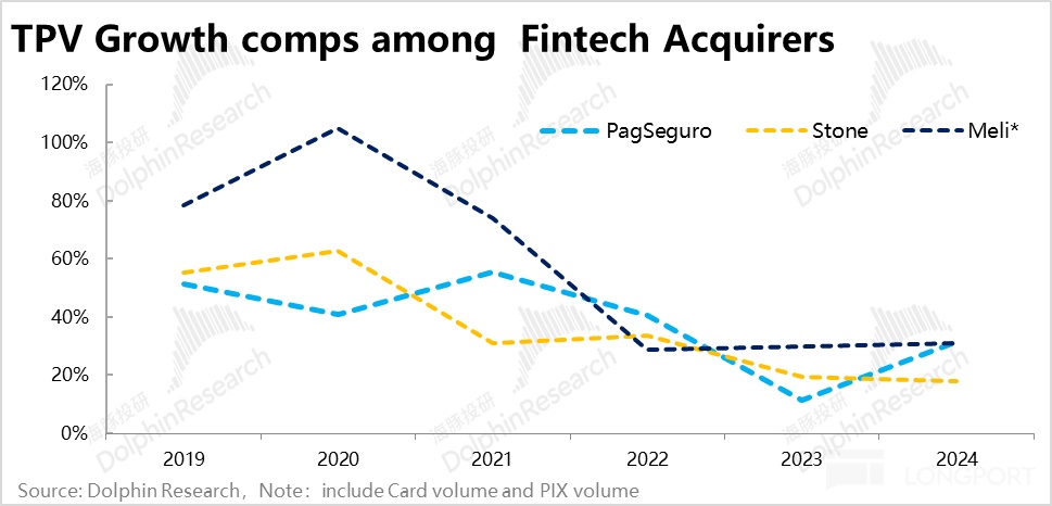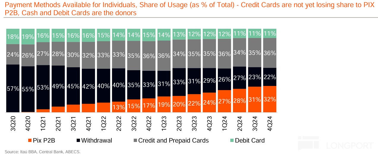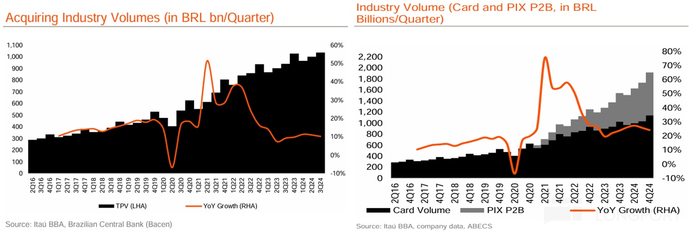 在PIX推出后,因其出色的便利性,迅速成为了巴西最主要的支付方式之一。如下图所示,到4Q24在P2B支付上,通过PIX完成的支付额已到超过了银行卡支付额(包括信用和借记卡)的60%以上。且目前PIX P2B支付的增长速度仍然大幅跑赢银行卡支付。(由下图可见,纯银行卡支付额的增速已仅10%左右,而包括PIX后增速达25%上下)