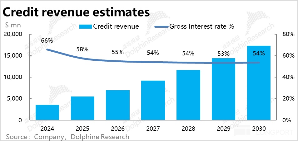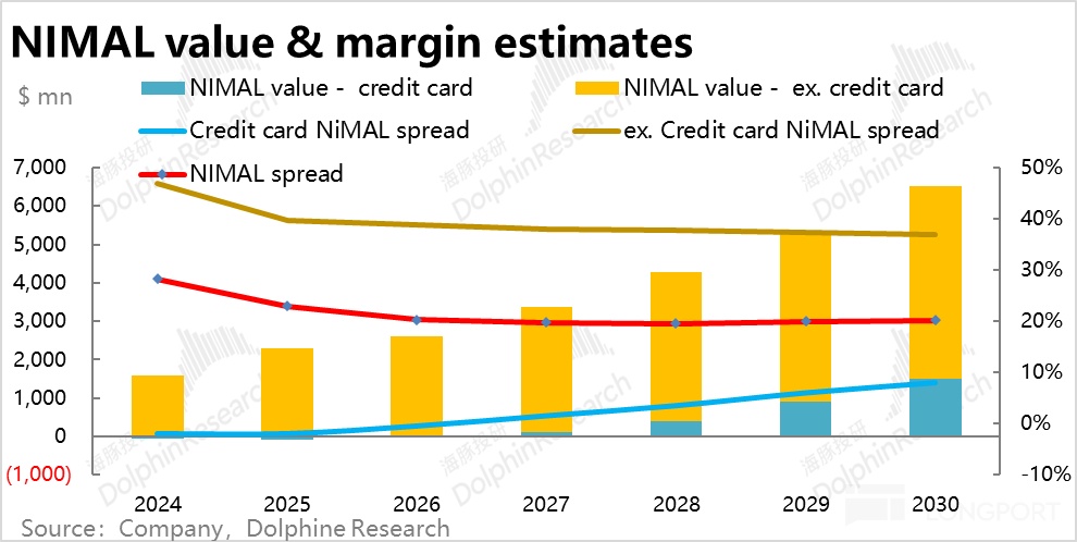 基于以上判断,以及非信用卡贷款随着增长逐步向信用更高的用户渗透,其毛利息率和NIMAL大概率会逐步平稳下降的判断,海豚预期公司信贷业务整体收入从25年的约55亿,增长到30年的约190亿,增长2.4倍。同时预期公司信贷业务的NIMAL从25年的约23%平稳走低到约20%。信贷业务贡献的NIMAL利润到30年达到约65亿。