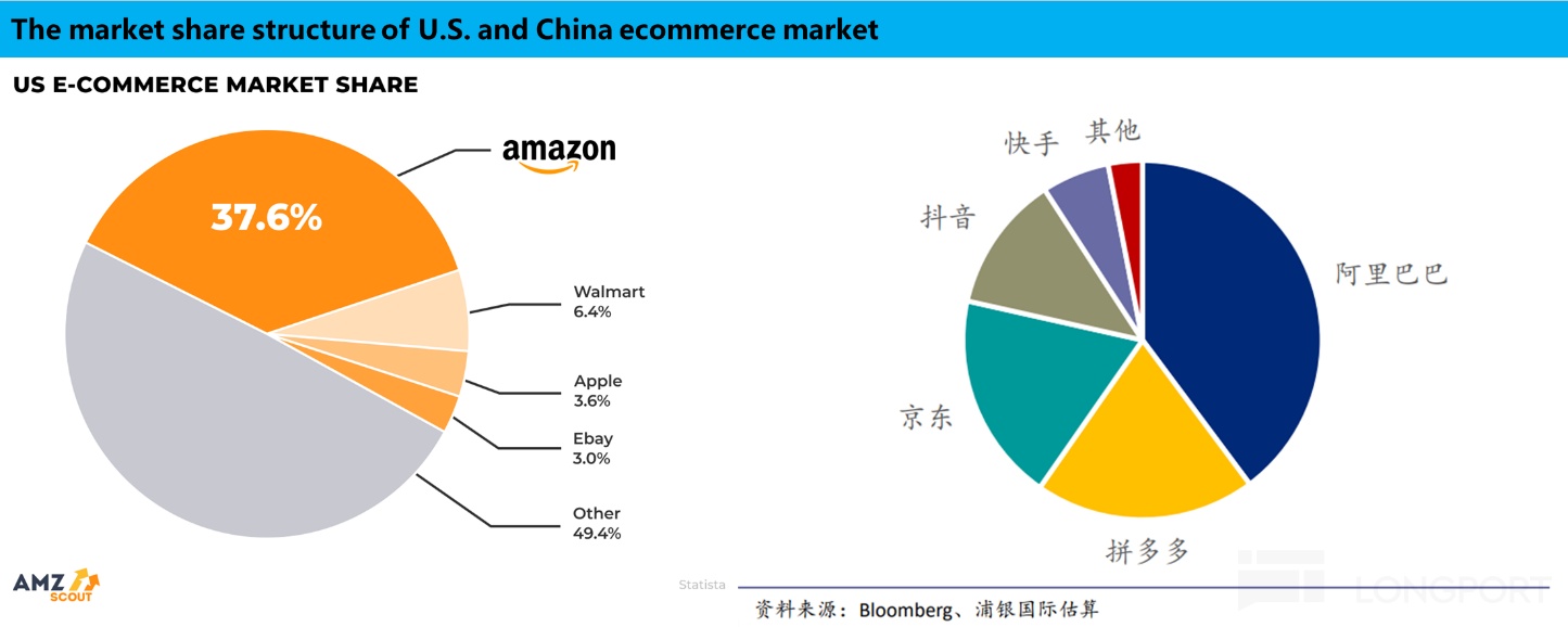 首先对于拉美地区电商市占率会不会进一步集中这个问题,可以参考中、美这两个最成熟市场的现状,哪个更会是拉美地区未来发展的方向。可以看到,中美两国市场的结构相当不同: