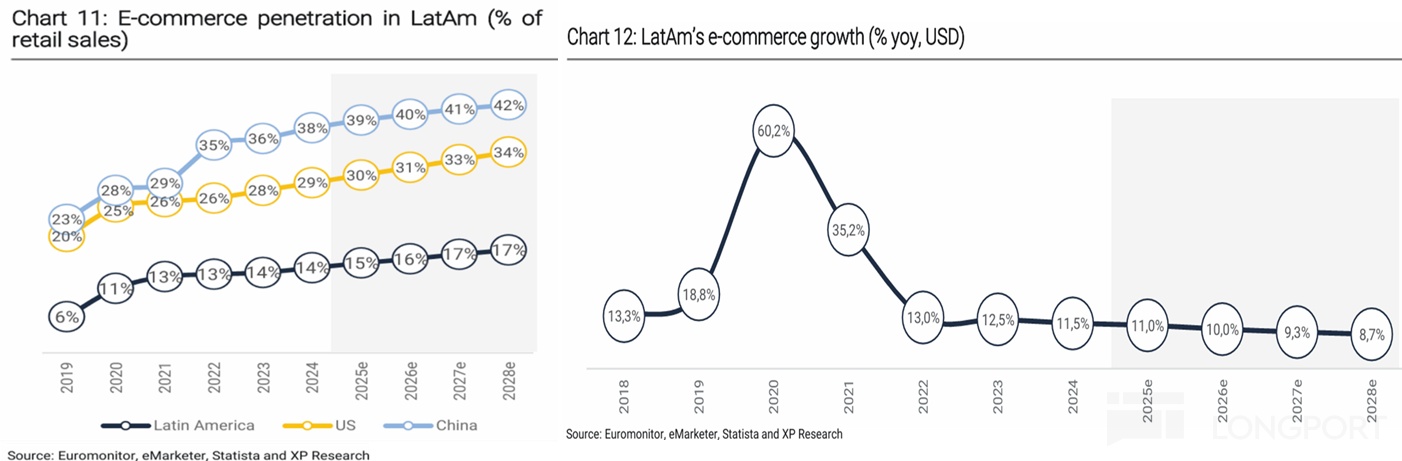b. 但从历史经验看,即便在很低的渗透率基数下,除了疫情红利期间,拉美电商行业的增长却并不迅速。如下图所示,红利期前18~19年间增速不足20%,而2022年后行业增速也随着疫情结束迅速滑落,并没能长久地延续高增长的状态。