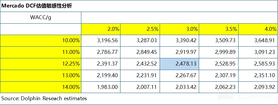基于上述预测,我们按2.5%的永续增长率和约12.2%的折现系数(考虑到Meli所处市场较高的风险)。折算出公司的合理估值约为1247亿美金,比现价高出约20%,对应每股价格$2460,与近期回调前公司横盘数月时的价格大体相当。