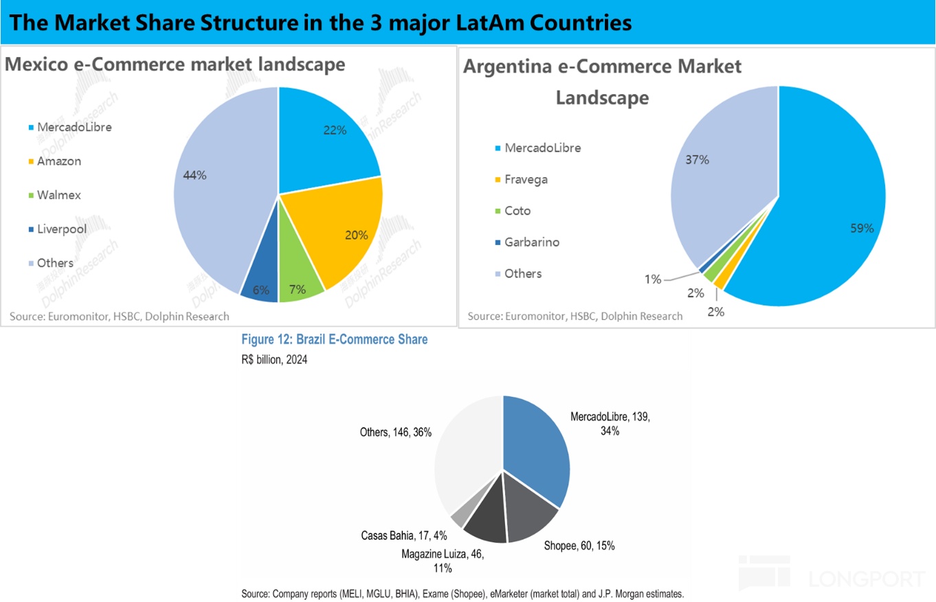 第二点,则是虽然Meli在拉美各主要市场内都已是最大的玩家(或之一),但同时拉美各主要电商市场的市占率仍是相当分散的,没有充分整合。在巴西、墨西哥和阿根廷三大市场内,仍有约40%上下的市场份额是由众多“不知名”的小玩家占据的。