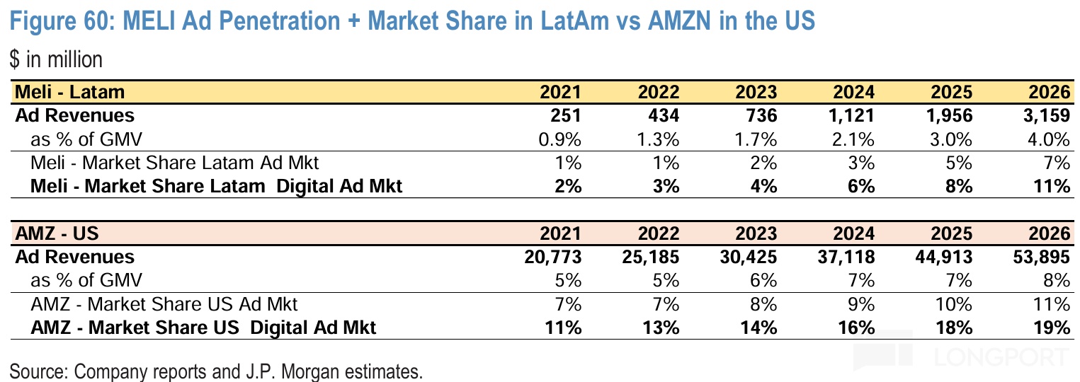 而目前Meli以在拉美市场整体略低于30%的市占率,到2025年是取得了拉美整体广告市场约5%的份额和近3%的变现率。换言之,后续若Meli在拉美电商市场的市占率也稳步提升到40%左右,那么Meli的广告份额和变现率应当也有机会能翻倍提升到Amazon一样的水平。