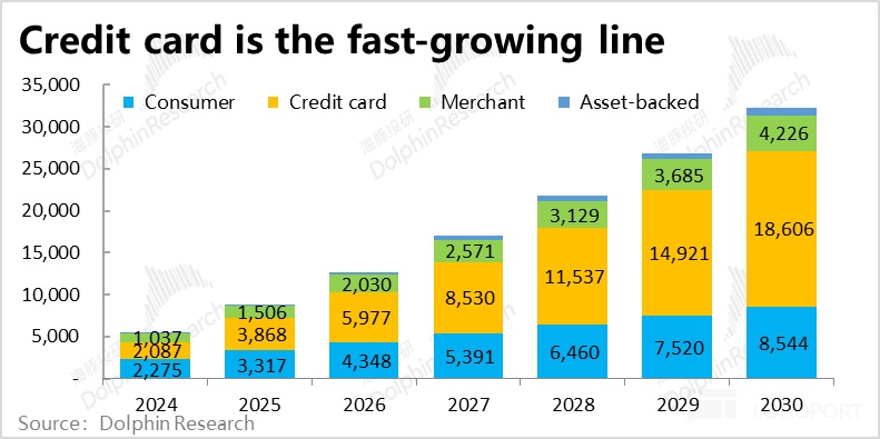 基于上述逻辑,海豚假设到2030年公司的平均贷款业务余额(年初、年末值的平均)增长到约320亿。整体复合增长近30%,其中信用卡业务复合增速37%。