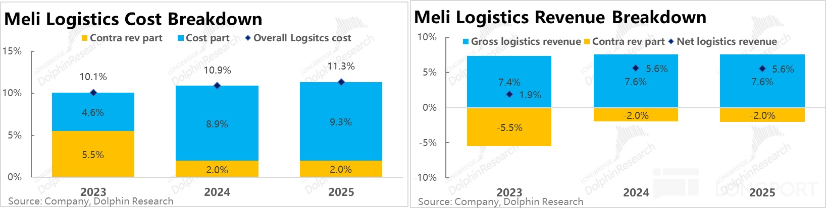 不过Meli对履约成本的确认,是分两部分确认在履约收入的减项和成本中的。根据公司的披露,Meli履约的毛变现率(加回收入减项)近3年来约在7.5%上下小幅波动,履约的总成本则由2023年的10%(占GMV)左右持续走高到了25年的约11%。即近3年来Meli的履约变现率大体不变,但履约成本则连年走高,公司在履约上的毛利率持续为负,且从23年的-2.7%(占GMV)逐渐走阔到25年的-3.7%。
