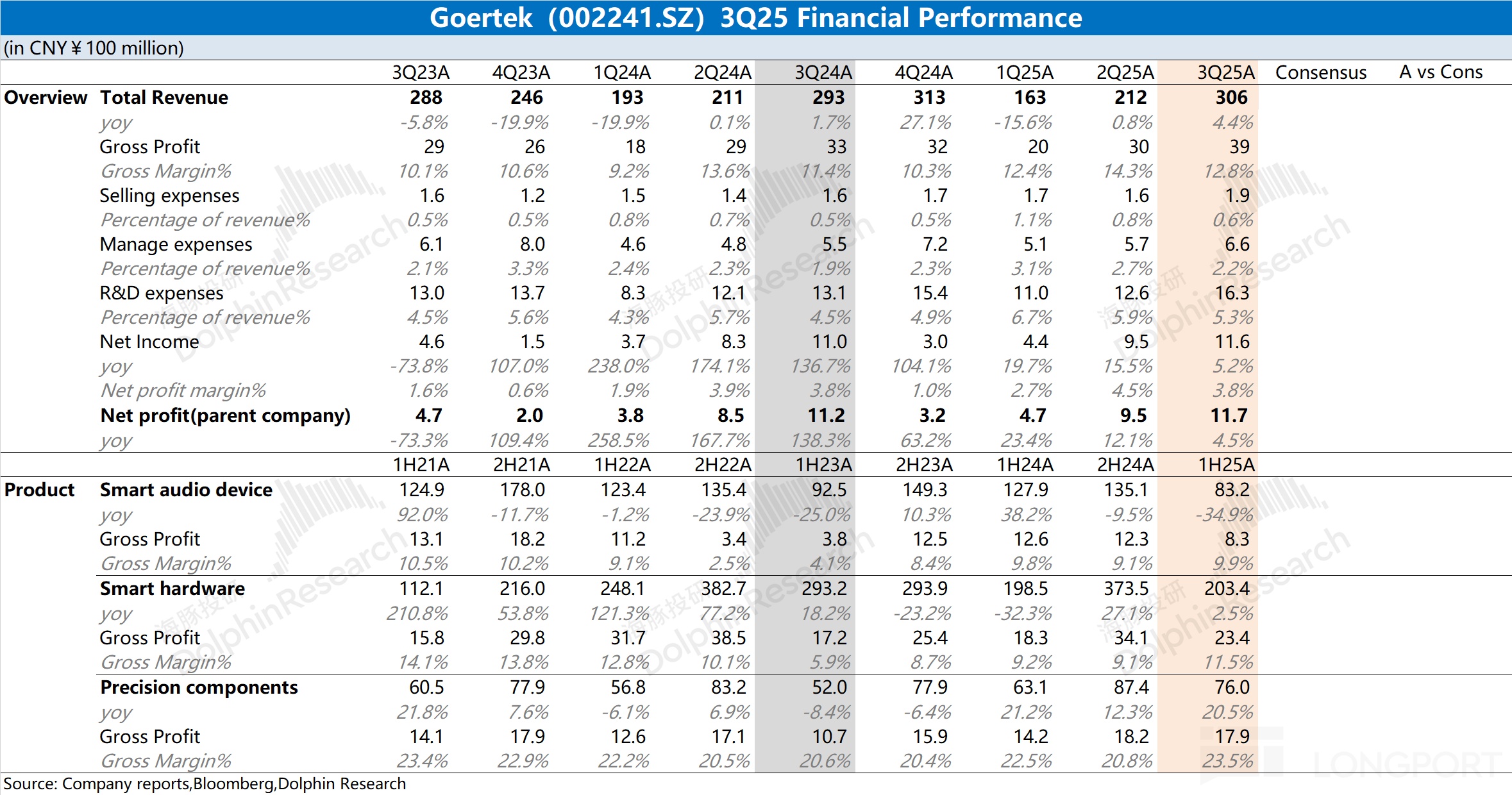 ①歌尔股份 2025 年第三季度总营收 306 亿元,同比增长 4.4%,好于市场预期(280 亿)。$歌尔股份(002241.SZ) 收入端的增长,主要得益于下游客户备货的拉动,部分为 9 月的 iPhone、AirPods 及 MR 等新品发布准备;