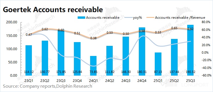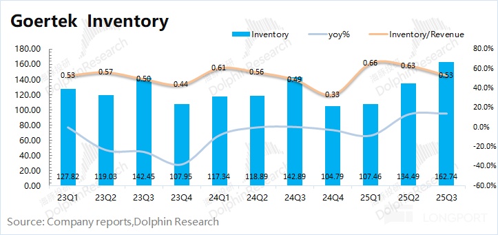 ①歌尔股份 2025 年第三季度存货 163 亿元,同比增长 14%。在下游新品备货的带动下,公司存货绝对值有所增加,但存货/收入的比值仍在相对合理范围。