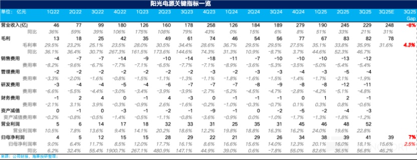 3. 三季度净利润端略超预期,主要由于毛利率的提升:三季度阳光归母净利 41.5 亿元,同比增长 57%,略高于市场预期 39 亿,而归母净利率达到了 18.1%,环比上行了 2.1 个百分点,主要由于海外业务占比提升带动的毛利率端超预期,叠加三费投入的环比减少。