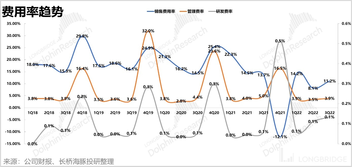 公司前三季度单季收入增速分别为 3.1%/7.5%/16.0%,海豚君从量价关系分析,其中绝大部分贡献源自于销量的提升,前三季度单季销量分别为 2.8%/0.5%/10.6%。