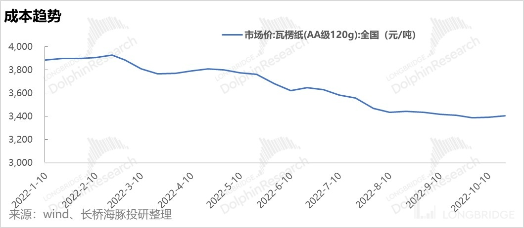 海豚君以前给大家科普过,啤酒成本构成中有 50% 左右是包装物的成本,其中玻璃瓶占比 35%,铝罐占比 10%,纸箱占比 5%。而铝材、玻璃瓶、瓦楞纸等包材价格自 3 月份开始陆续回落。