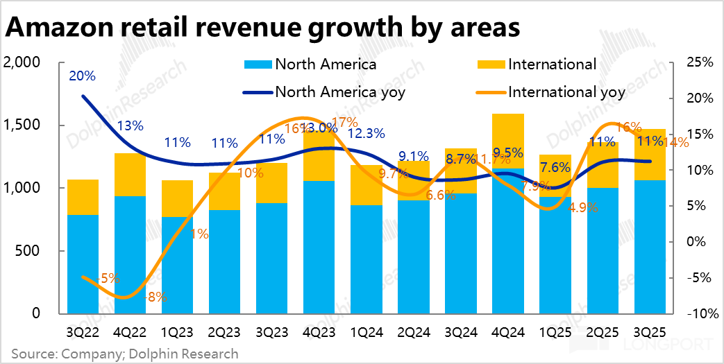 其中北美零售收入增速为 11.2%,比上季略微提速 0.1pct,这与美国统计局公布 6 月以来可见美国无门店销售增长在持续改善的趋势一致。目前北美的线上消费还是坚韧的。