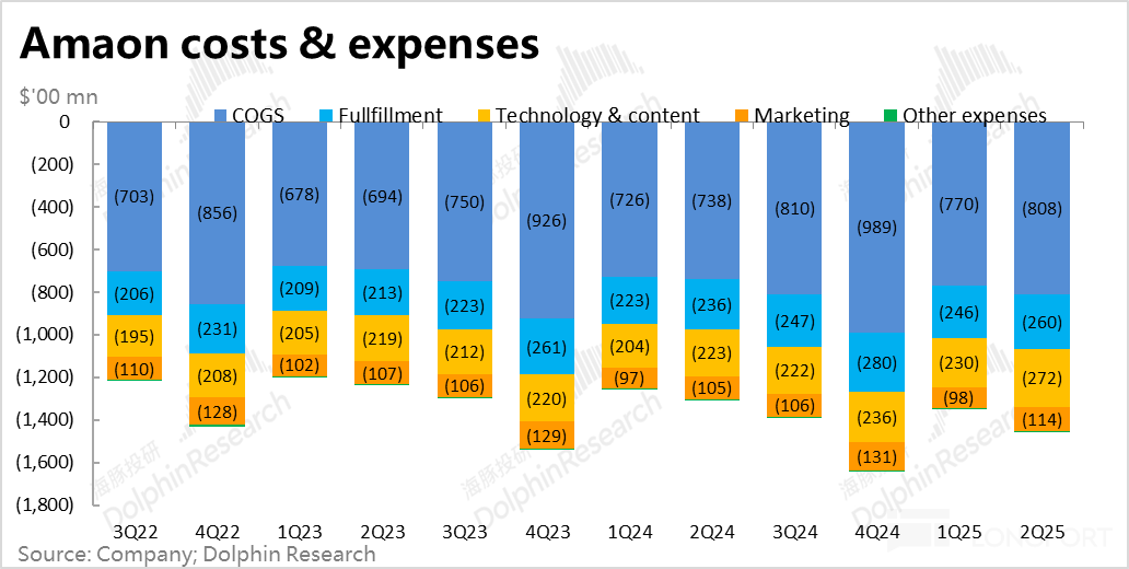 具体来看,履约、销售和管理费用支出的同比增长在 6%~12% 之间,仍并不算高。唯独是研发和内容费用一项,同比增长高达 30%,增速快速拉升。由于 AWS 的员工薪酬、研发成本、部分设备成本,以及流媒体内容的制作成本都记在此费用项目中,可见应当主要还是在云业务上投入的影响。