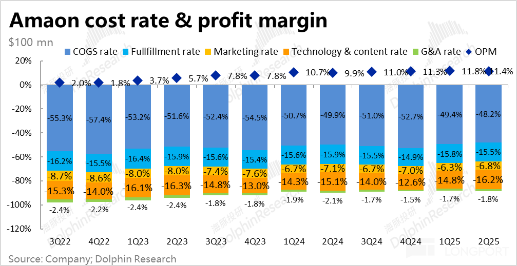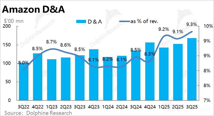 对应的,本季度亚马逊折旧占收入的比重在继续拉高,达到 9.3%,后续随着 Capex 的进一步增加,折旧的拖累可能更加明显。
