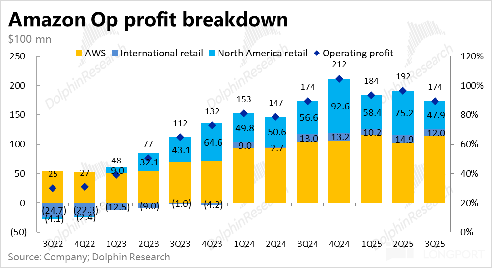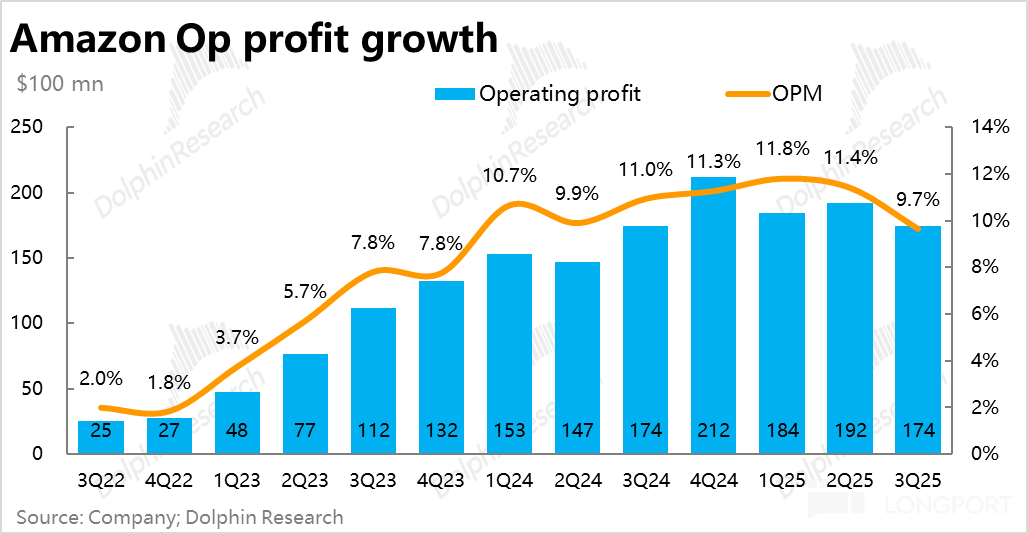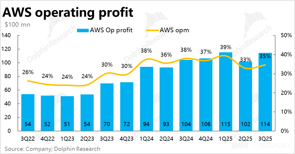 本季 AWS 实际经营利润约$114 亿,虽仅同比增长 9%,但还是稍好于预期的。