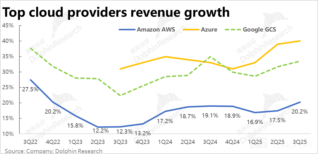而本季在两个竞争对手增速上升斜率有所放缓的同时,AWS 呈现出的加速迹象,预示着 AWS 无论是报表上的增速,还是在业务层面(尤其是 AI 相关)上差距正在收缩。