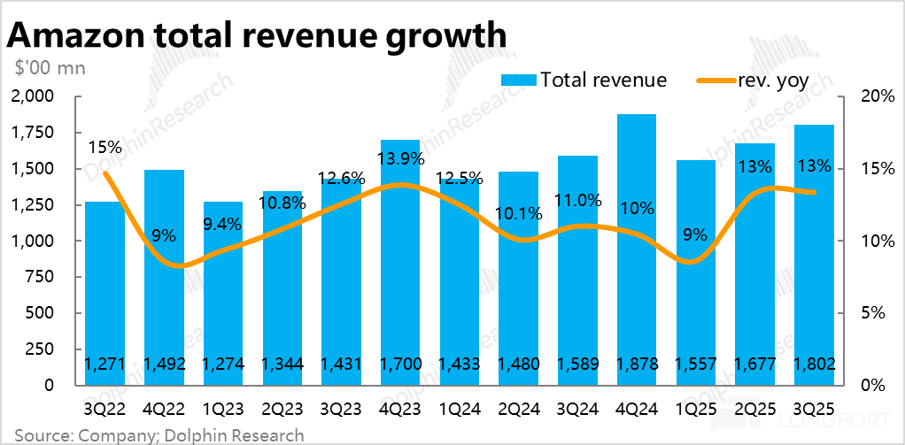 合计所有业务,在 AWS 超预期提升增长,以及电商板块也稳健增长的带动下,亚马逊本季整体收入 1802 亿,同比增长 13.4%,环比略微提速 0.1pct,也跑赢市场预期的 1778 亿。