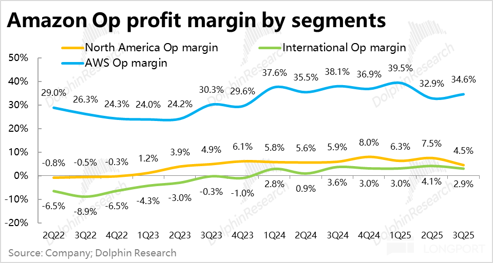 分板块看,前文已提到了 AWS 的利润率虽然再走低,但是大体符合预期的。而零售板块内北美地区的经营利润再加回 25 亿法律费用支出(不加回裁员费用计提)后约为 73 亿,与市场预期大体一致,对应经营利润率为 6.9%,同比仍是提升 1pct的。属于符合预期还不错的表现。