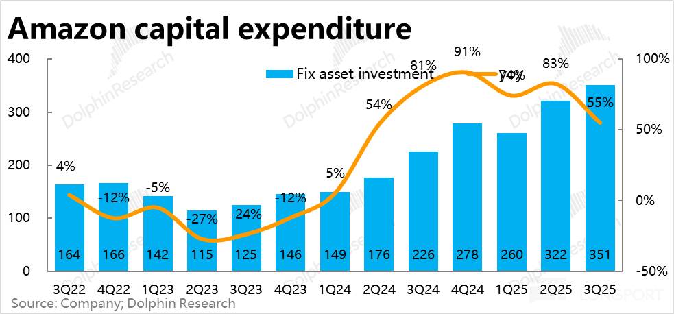 本季度亚马逊的 Capex 也进一步拉高至$351 亿(这里是公司现金流量表中披露的口径,和电话会中口径有一些误差,但大体相同),再创历史新高。除了在云业务上的投入外,公司因目前也在投入电商物流、即时配送和卫星项目,因此绝对支出额可谓是巨头中最高的。