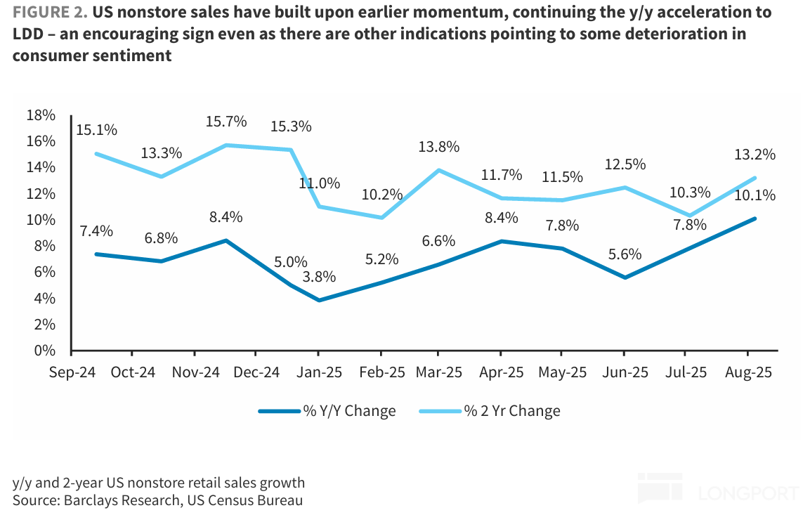 根据美国统计局,6 月以来可见美国无门店销售增长在持续改善,可见目前北美的线上消费还是坚韧的,和亚马逊的数据趋势一致。