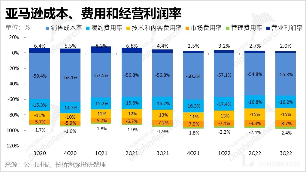 从成本和费用的角度来看,首先,本季的毛利率环比下降了约 0.7pct 到 44.7%,海豚认为原因一是云业务的运营成本有所上升,二是 Prime Day 的大促期间一般也会导致自营零售业务的毛利率下降。