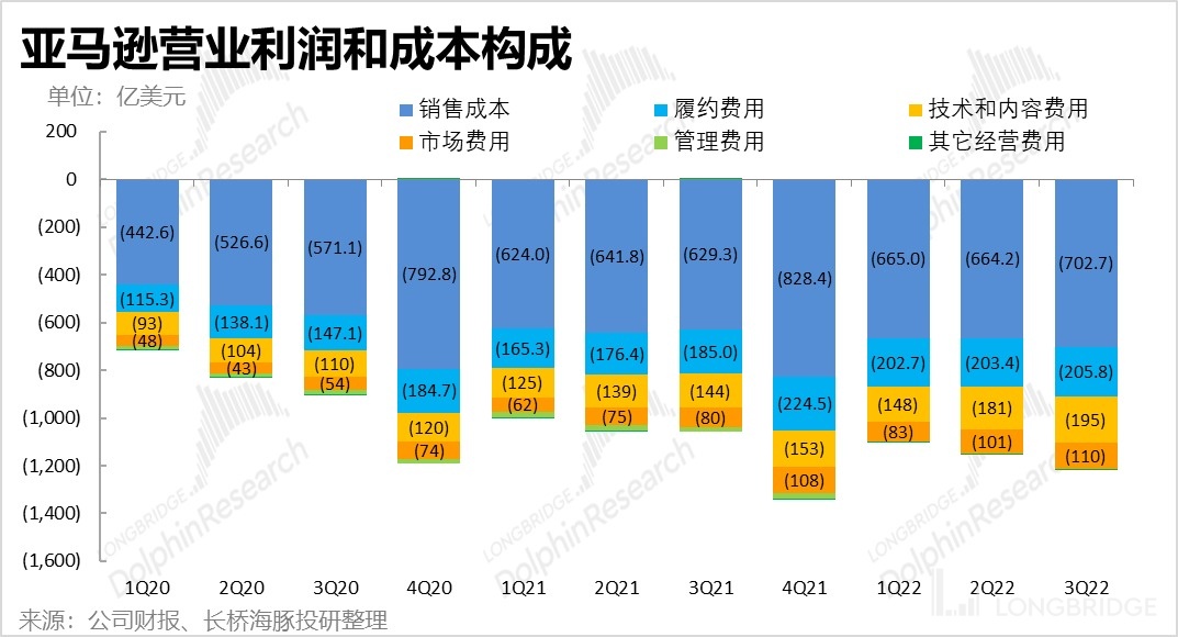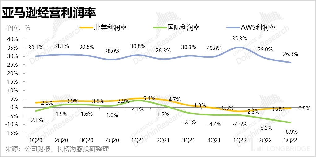 分板块来看,除了上文已提到的 AWS 云业务利润超预期下降外,可以看到国际零售业务虽然营收增长已重新提升,但仍处在收入越多亏损也越大的低效运营状态,本季经营亏损达 24.7 亿,环比上季明显增加。