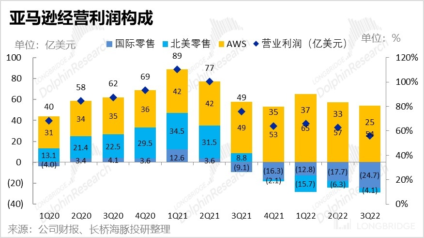 仅有在消费超预期坚挺的北美零售,在利润上实现了超预期的表现。北美零售本季度在营收增速大幅反弹的同时,经营亏损也由上季度的 6.3 亿,缩窄到本季的 4.1 亿。比市场预期约 10 亿的亏损也好出不少。