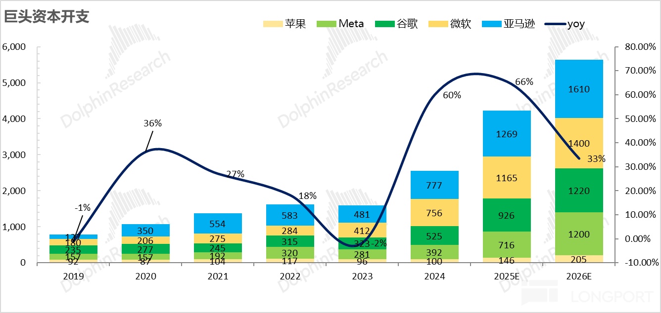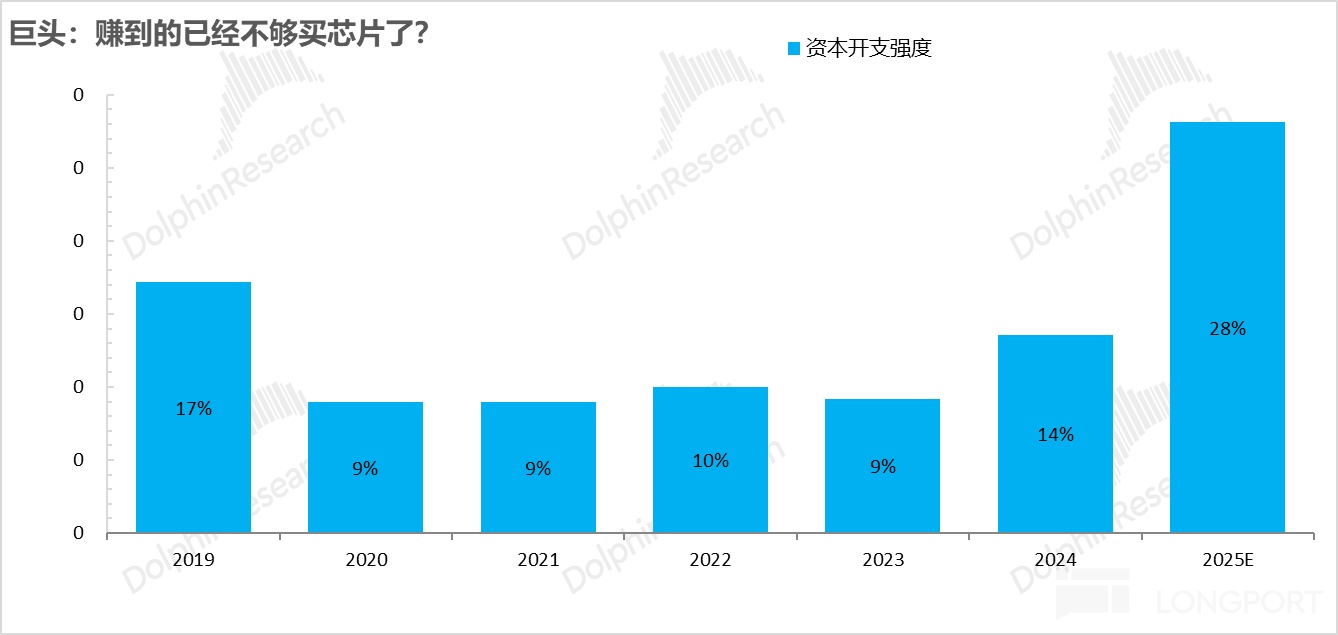 2)资本开支强度持续拉高的背后,显然是没有等比例的收入增长,来稀释这些资本开支。如果资本开支比例持续较高,市场会开始担心这些美股引以为傲的轻资产巨头是否正变得重资产化。