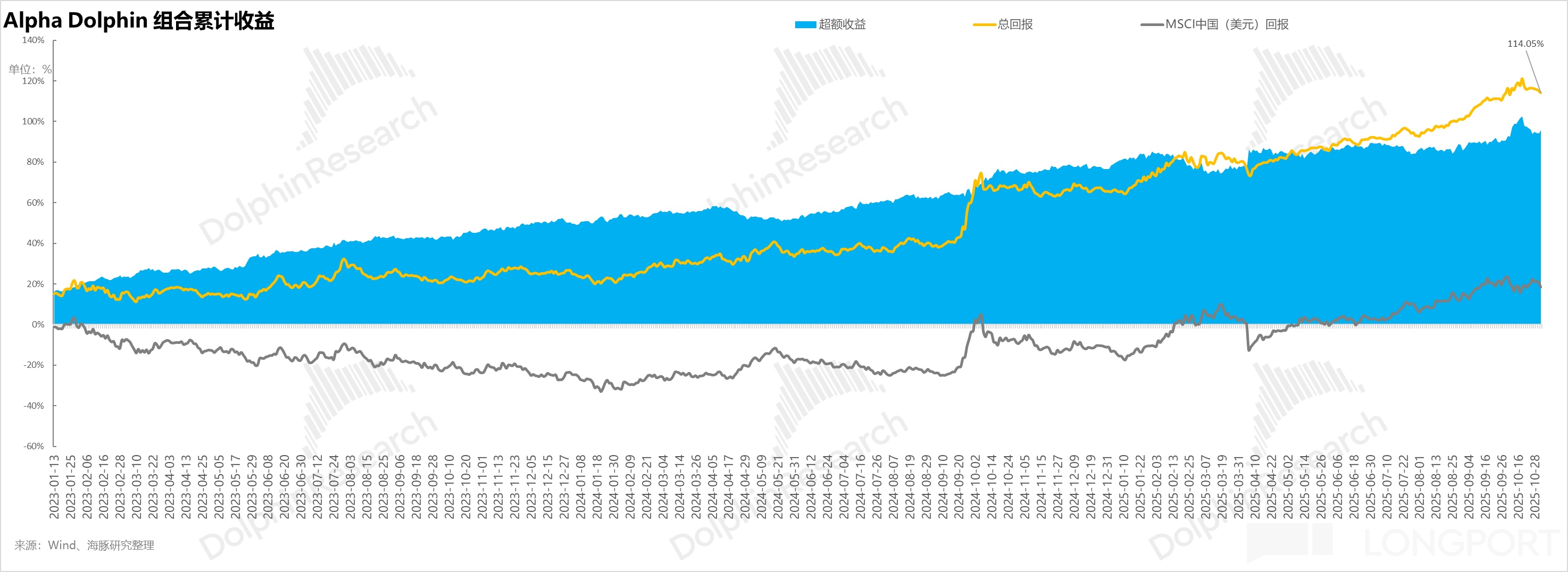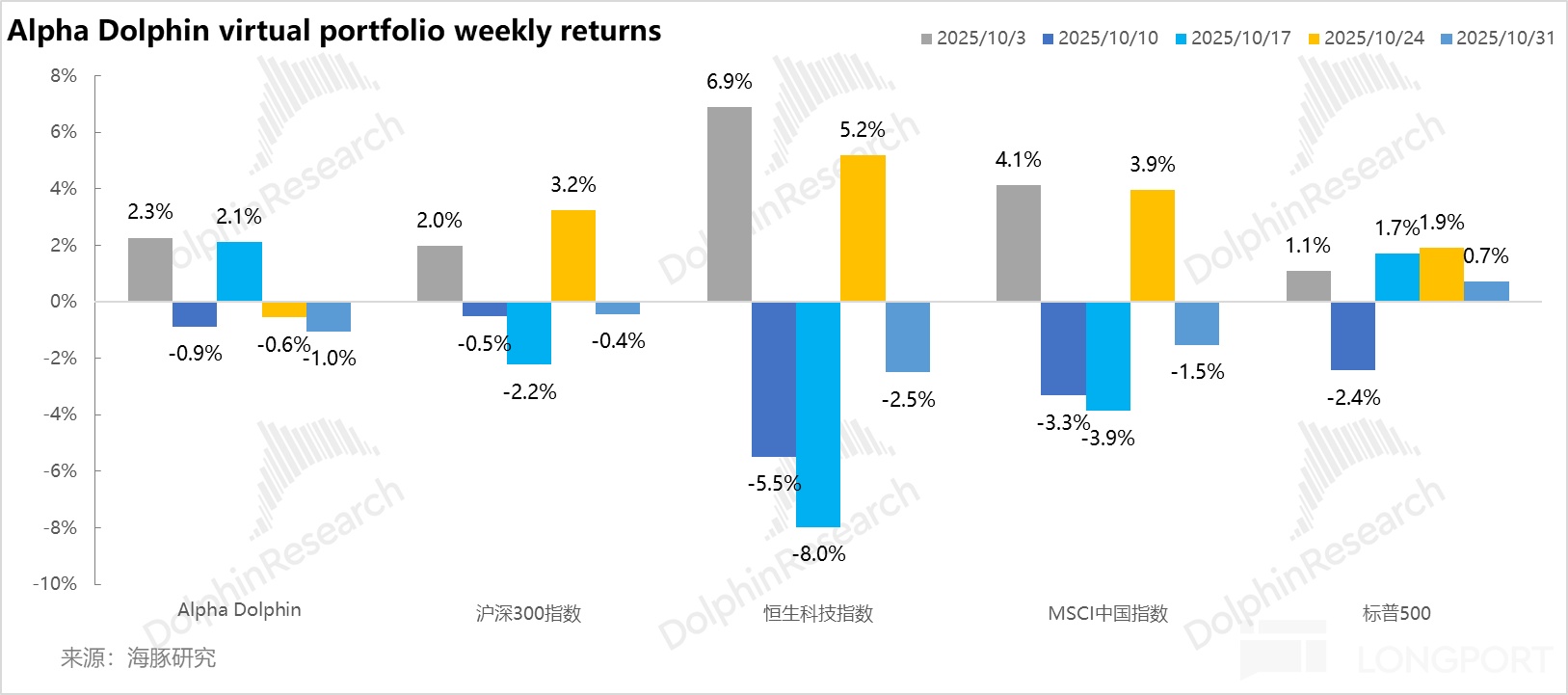 上周,海豚投研的虚拟组合 Alpha Dolphin 未调仓。当周下行 1%,跑输沪深 300(-0.4%),以及标普 500 指数(+0.7%),但跑赢 MSCI 中国指数(-1.5%)与恒生科技指数(-2.5%)。一方面是因为虚拟仓位中黄金持仓较高,另一方面是因美元走强拖累中概表现。