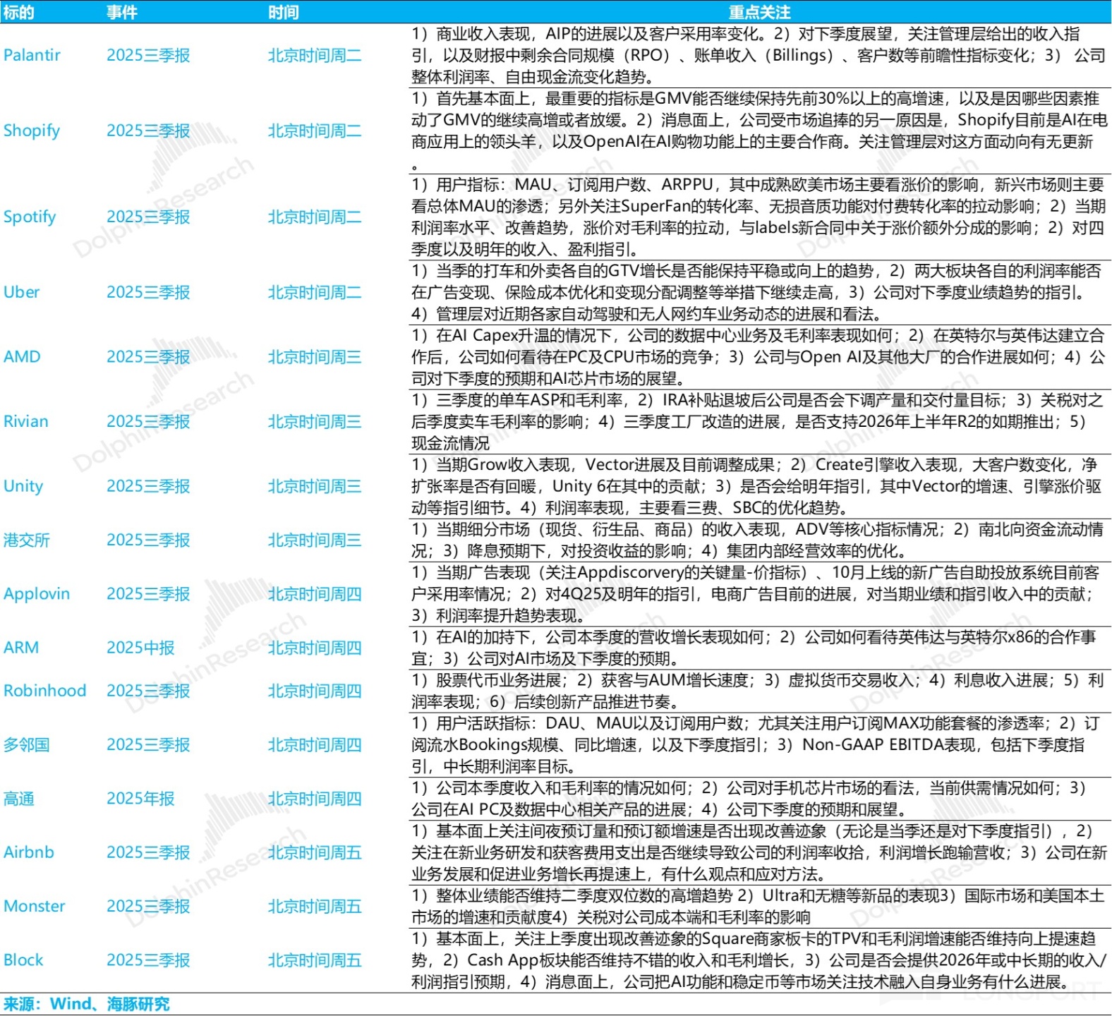 从本周开始,美股进入小巨头的财报季,从 Palantir(目前已不算小巨头,市值已是软件股前三)、Shopify 等可以观察 AI 的推进进展,具体公司较多,海豚君已给大家整理好,具体如下: