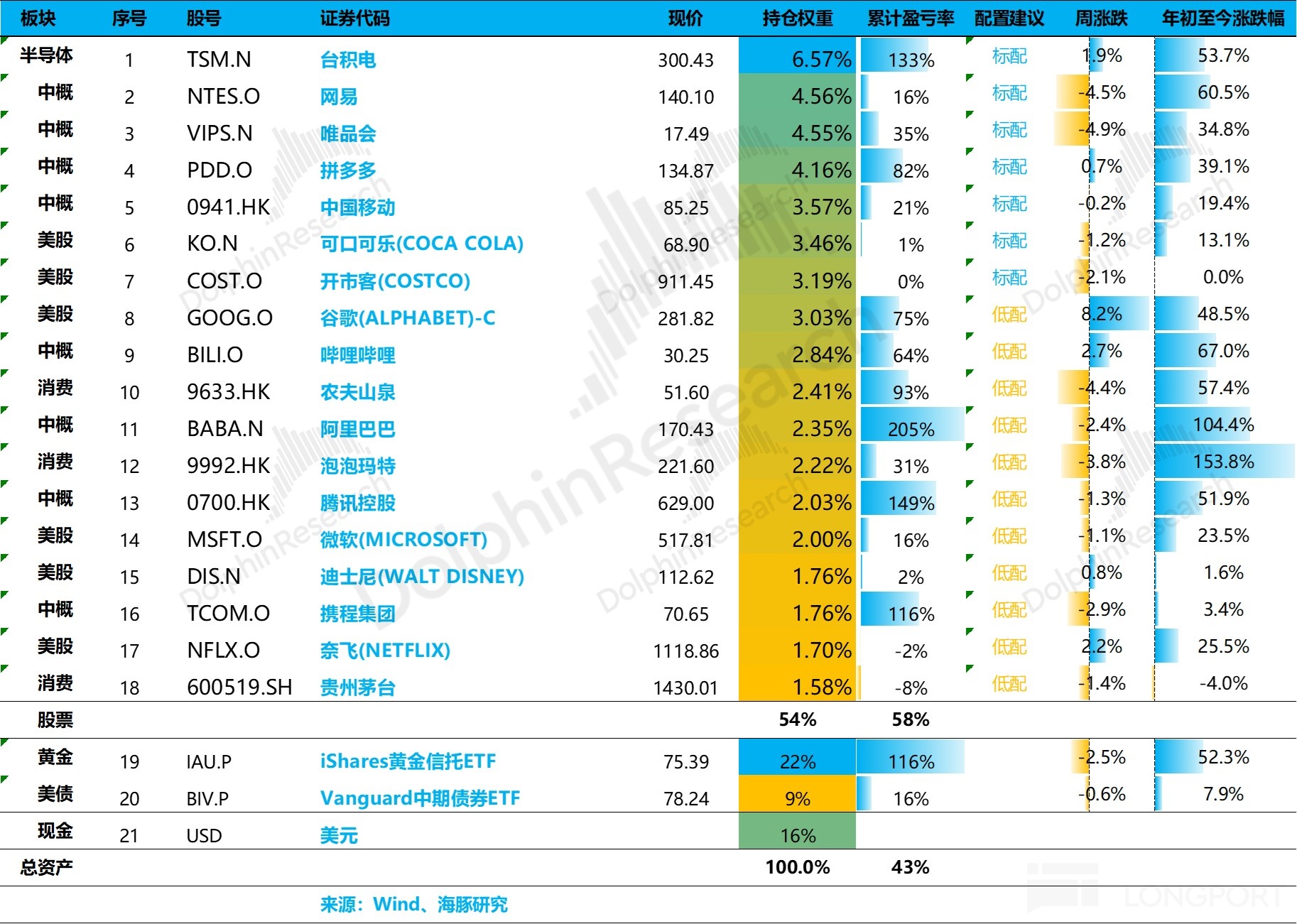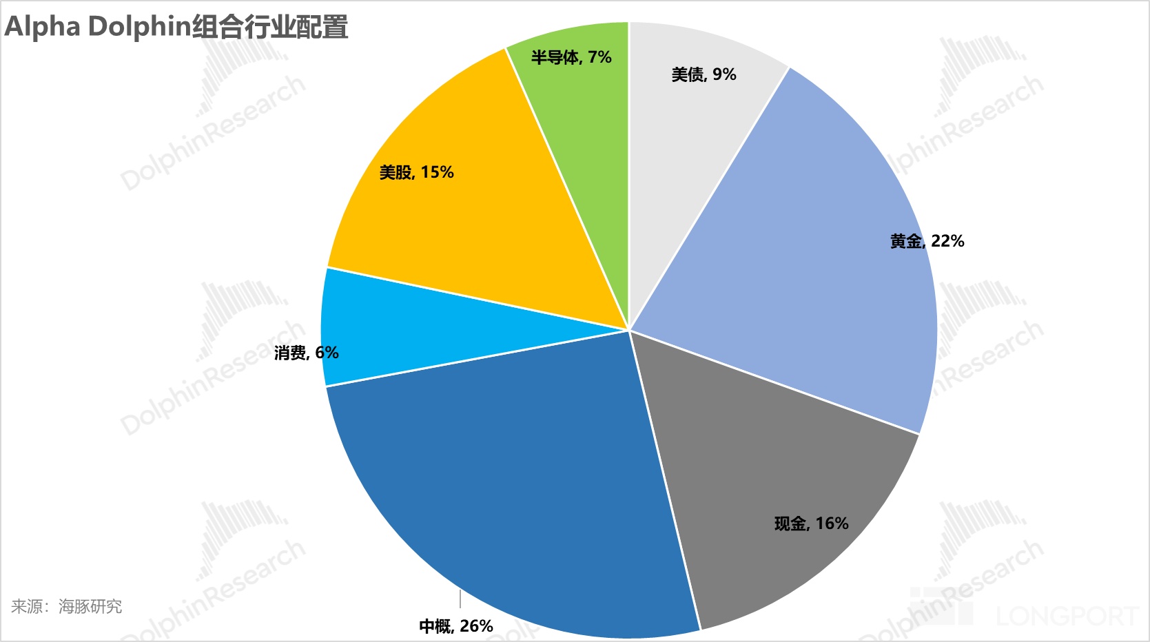 Alpha Dolphin 虚拟组合共计持仓 18 只个股与权益型 ETF,其中标配 7 只,其余低配。股权之外资产主要分布在了黄金、美债和美元现金上,目前权益资产与黄金/美债/现金等防守资产之间大约 55:45。