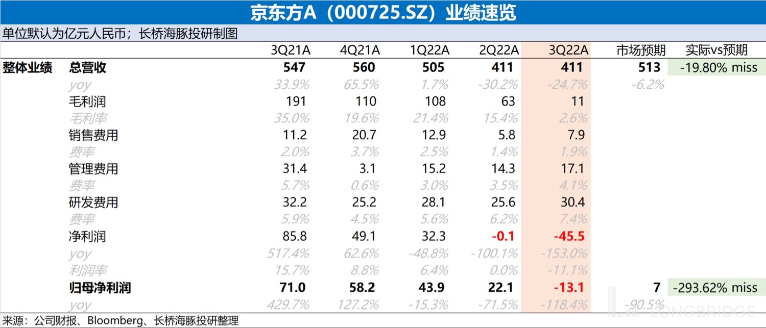 1、营收端:需求疲软,带来业绩大幅下滑。$京东方A(000725.SZ) 2022 年第三季度总营收 411.3 亿元,同比下滑 24.7%,低于彭博一致预期(513 亿)。公司营收大幅下滑的主要原因是,三季度面板价格的继续下行和产能利用率的调低。而由于面板行业下游主要是电视、PC 等显示器,而下游疲软直接影响了行业面的出货。