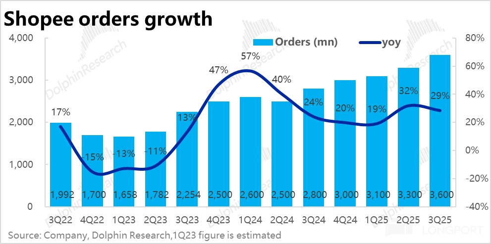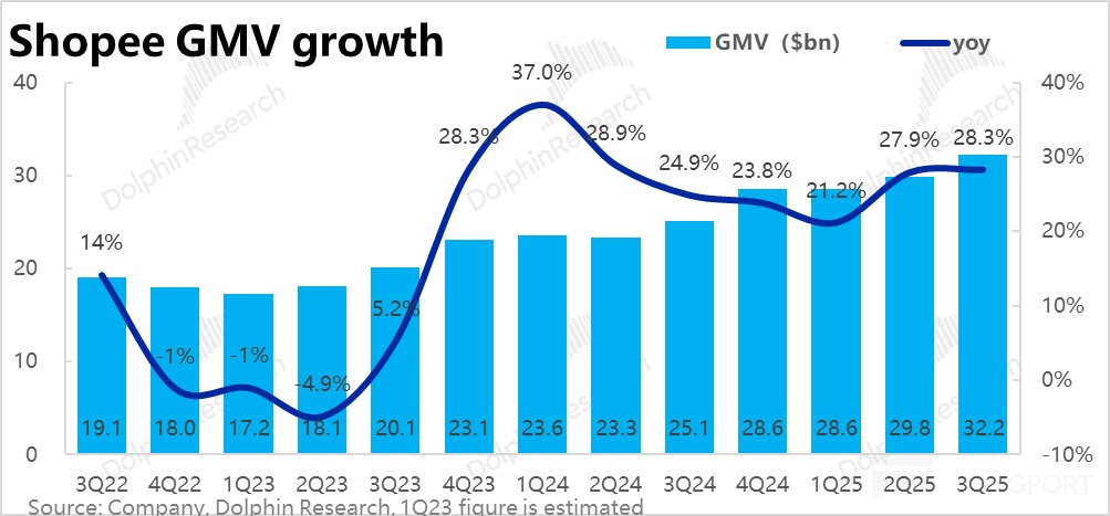 最重要的Shopee 电商板块,本季度增长端表现仍可谓相当强劲。关键的GMV 同比大增 28.3%,相比上季进一步略有提速,也再度大超卖方预期的 25.4%。