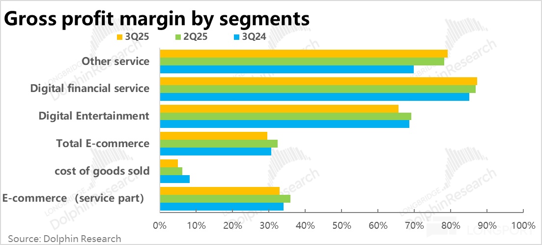 而分板块来看,电商业务与游戏业务的毛利率则从同比和环比角度都是下滑的。而金融业务的毛利率虽仍在提升,但提升的幅度也开始缩窄。